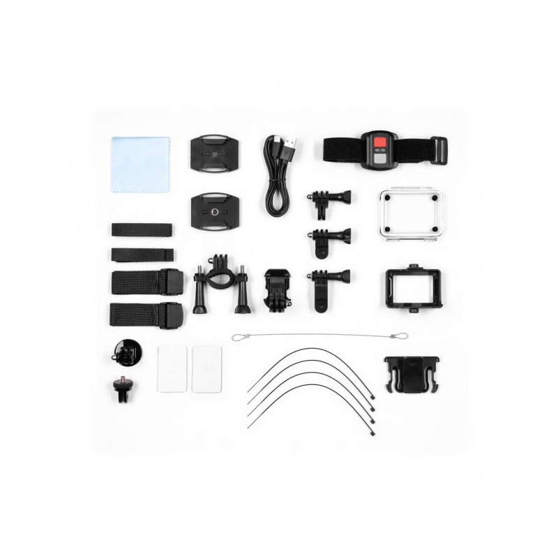 Príslušenstvo: Vymeniteľný panel puzdra, držiak na bicykel, rám s klipom, 2x montážny klip s páskou, 2x krátke konektory, 1x dlhý konektor, hlavica, 2x popruhy na suchý zips, 2x popruhy s patentným zapínaním, 2x montážna páska, bezpečnostný kábel, 4x káblové zväzky, handrička