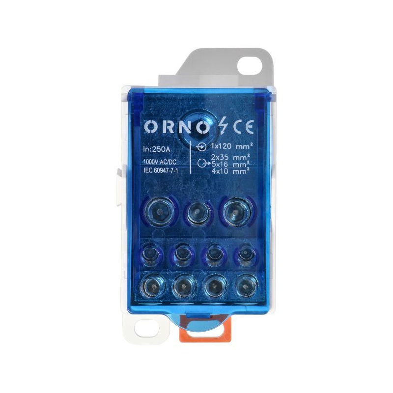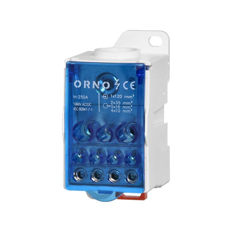 Rozvodný blok 250A je vybavený vstupnou svorkou 1x120 mm2 a výstupnými svorkami 4x10, 5x16 a 2x35 [mm2]. Rozmery zariadenia 96 x 49 x 50 mm. Rozvodné bloky ORNO sú navrhnuté tak, aby umožňovali rozšírenie s možnosťou vytvorenia zložitejších elektrických pripojení a distribúcií. Svorkový rozvodný blok má stupeň ochrany IP 20 a je dodávaný v modrej farbe.